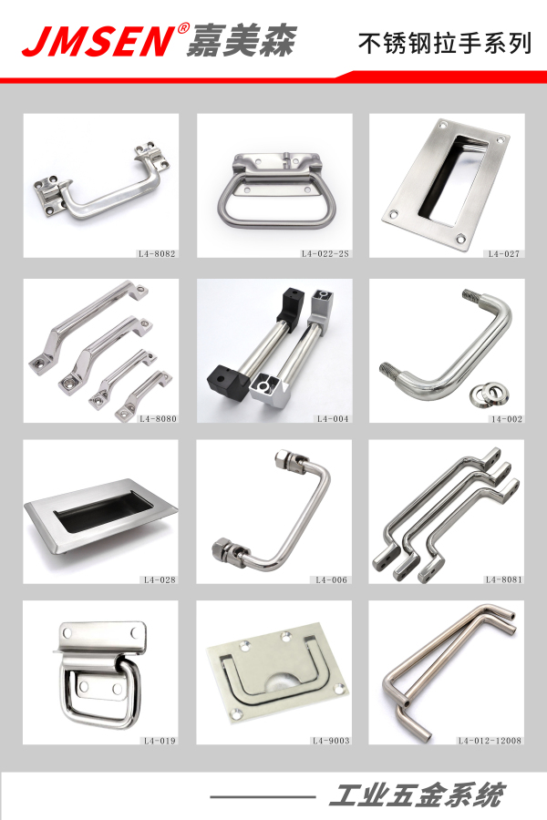 两个商标,推出自主知识产权,并开始面向中国大陆、港澳台以及国际市场。 嘉美森工业五金致力于机箱机柜、高低温环境设备、步入式陈列室冷藏冷冻设备,特种车辆,航天航空、生物医疗及包装储备设备、食品机械设备、新能源及环保设备以及各种国标、非标箱体钣金设备上的高品质五金结构件的研发、制造与销售,以精益求精的技术,高品质的概念,优质的服务团队,贯彻企业的经营理念,树立优质的企业形象,本着客户至上,超越客户期望为动力,成为优质的工业五金结构件整体方案解决专家。 嘉美森工业五金是一家主要从事工业五金配件产品生产与加工及自主销售为一体的企业。自成立以来,本厂始终坚持以人为本,以创新为发展动力,秉承“信誉第一,质量至上”的经营理念,争创市场一流品牌。公司的主营产品为工业五金配件,如工业五金柜锁、铰链、搭扣、拉手把手、脚轮脚座以及各种非标件的定制等。我们秉承价格合理,质量上乘的优势,在消费者当中享有较高的地位,赢得了广大客户的一致好评。志存高远,锐意进取。在机遇与挑战面前,嘉美森将不断求索,愿与所有的伙伴一路同行,一同成就未来,共建伟业!